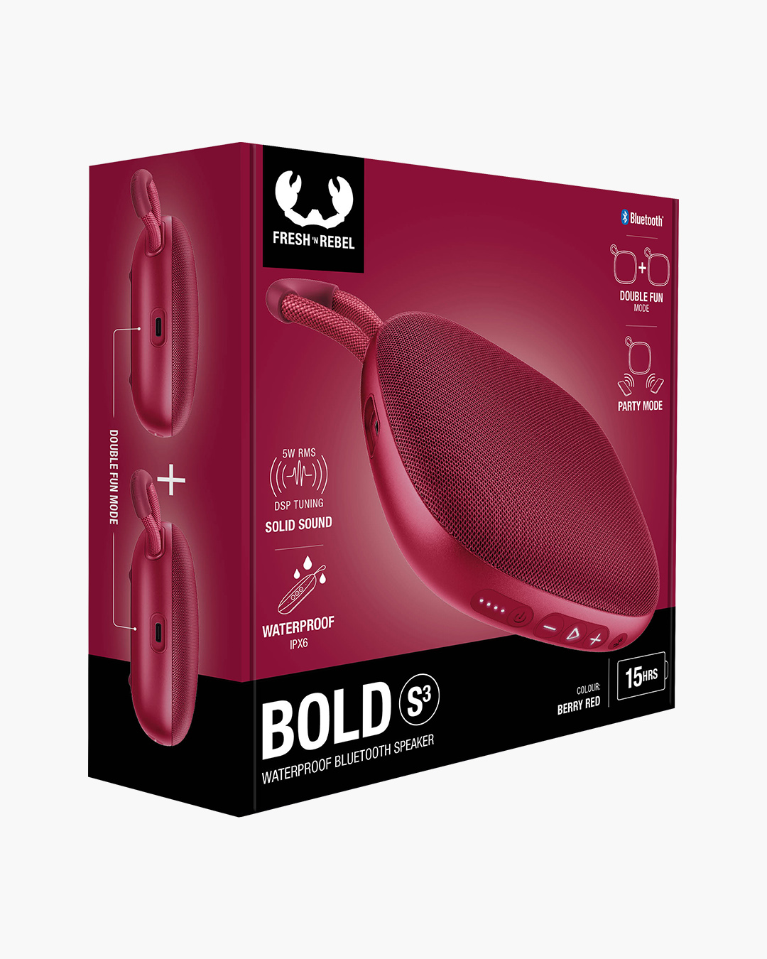 DC input: 5V/2A max. (USB-C)Battery: 7.4V/2500 mAhWaterproof (IPX6)Party Mode (connect 2 devices to one Bold S3 speaker)Double Fun Mode (pair two Bold S3 speakers)5W RMS Full-Range SpeakerBluetooth 6.0