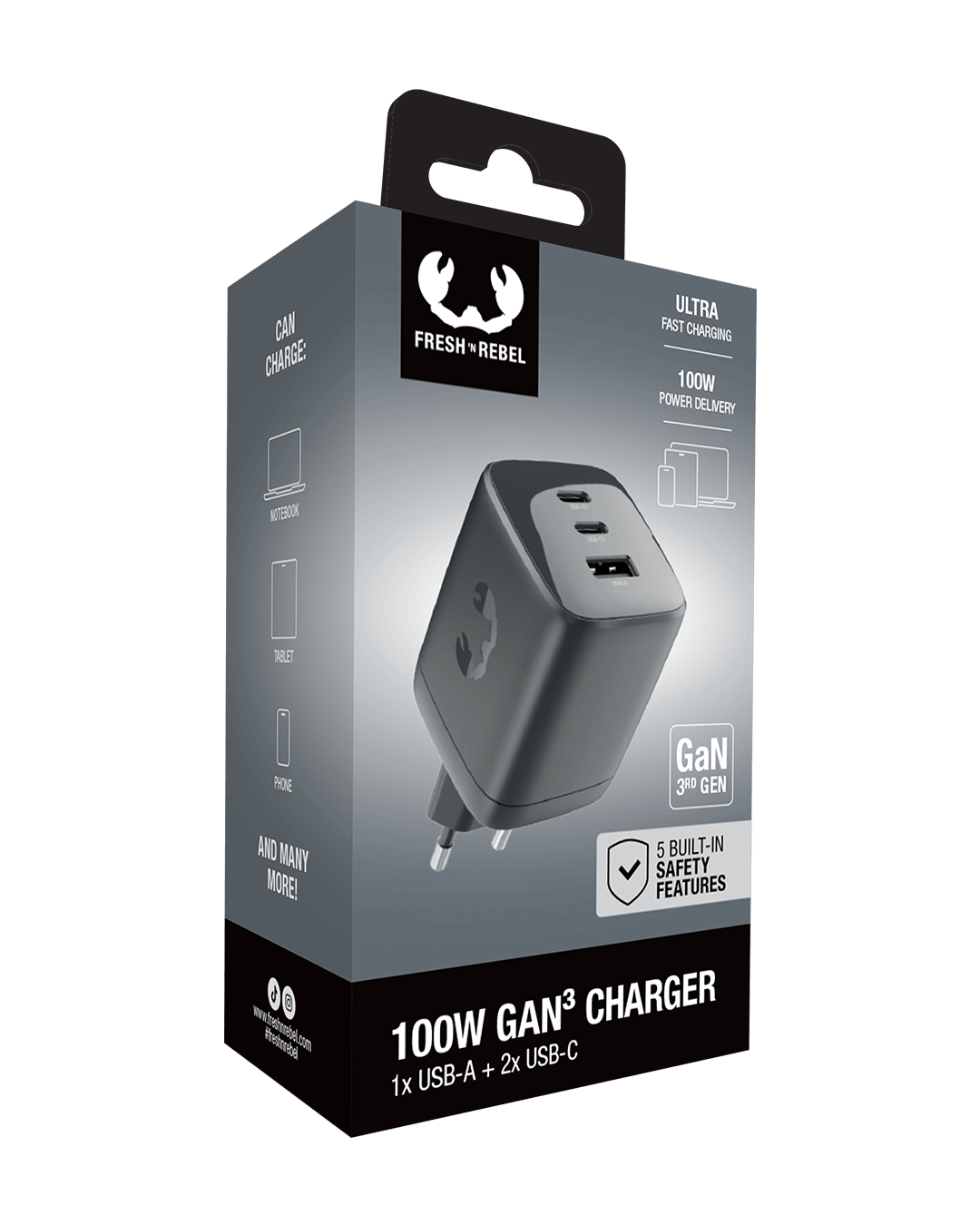 2x 100 W USB-C + 1x 18 W USB-A